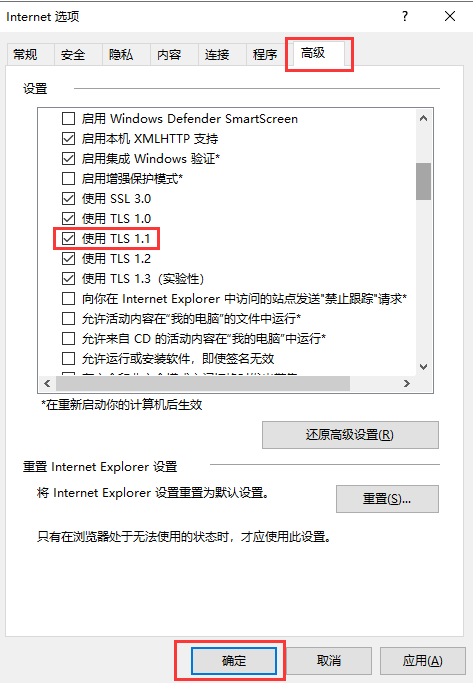 3.如不能正常访问,请清理浏览器缓存,检查浏览器“Internet选项”配置确保勾选“使用TLS 1.0”,建议同时勾选“使用TLS 2.0”、“使用TLS 3.0”和“使用SSL 3.0”(如下图所示)。